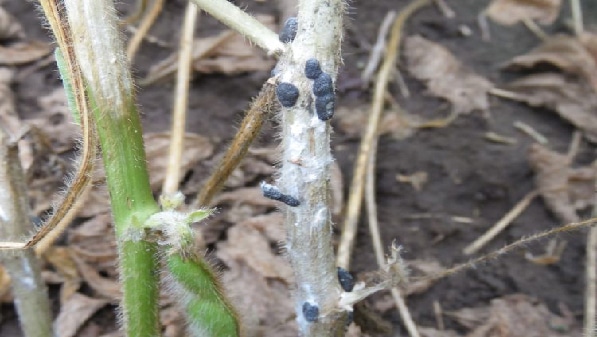 Fungus that can live in the soil for up to 10 years, favored by cool wet conditions, infection occurs at a water soaked lesion at a node that remains water soaked, disease can quickly spread by contact with other plants.