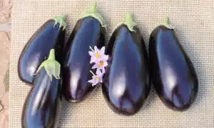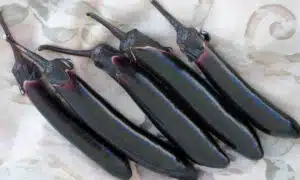 Not only is Dairyu early, but it will produce over a long season. 7″ – 10″ long fruit is nearly black with matching sepals. Fruit shape is long and thin with a slight pot-belly.