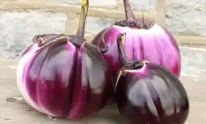 Shop Seed →Barbarella is an authentic Sicilian variety with a white-shaded halo and pleating. It has wonderfully dense white flesh, making it extra good for grilling. The round fruit is heavy for its size and up to 7″ diameter. The tall, sturdy, purple-tinged plant keeps going for a long season if kept picked.