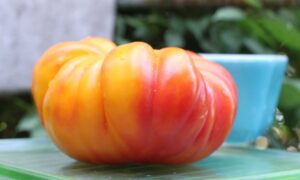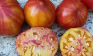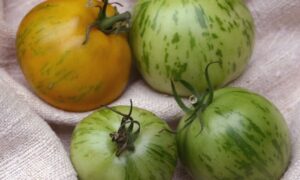 Flashy dark-green stripes on a yellow-green background. The flesh, when ripe, is yellow-green, tangy and juicy. At 5 – 8 oz., Zebra is smaller and smoother than most heirlooms, so you will have more marketable fruit than with the big beefsteaks. ORGANICALLY GROWN