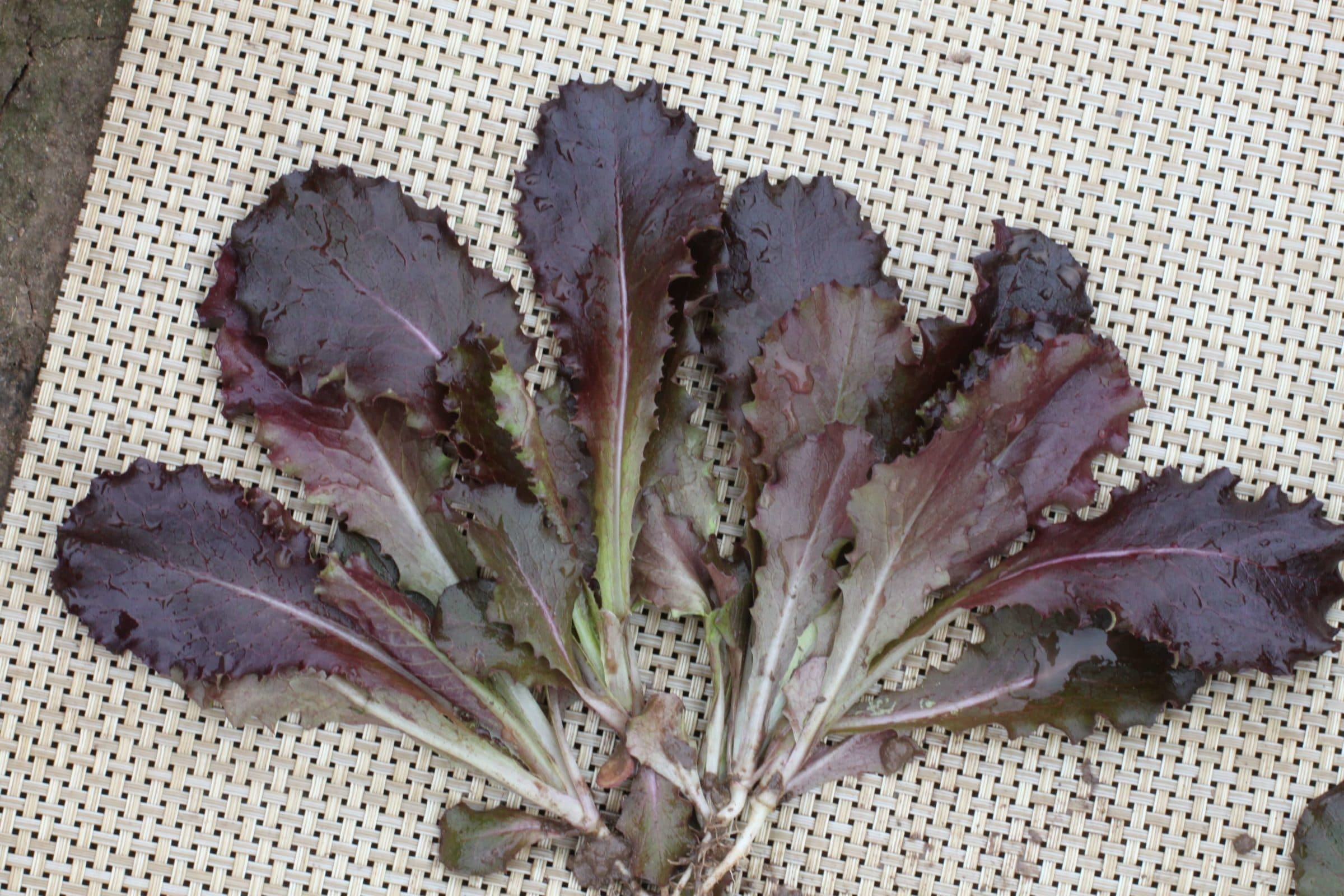 This stunning dark red baby romaine has thick texture and frilly leaf margin.