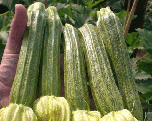 This hybrid improved version of an Italian heirloom has a sturdy flower attachment and is intended to sell with the flower. Romanesco squash has a unique firm texture and ridged waxy skin.