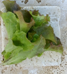 Red-tinged light-green leaf lettuce. The large plant has puckered, round leaves.