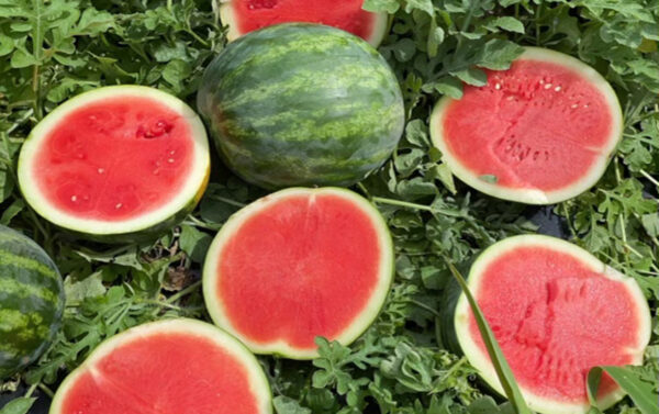 Outstanding yielder. Shape is round and uniform. Attractive dark skin with fading stripes. Flesh has an intense red color, very good rind thickness. Great shelf life. Brix 12-13%.