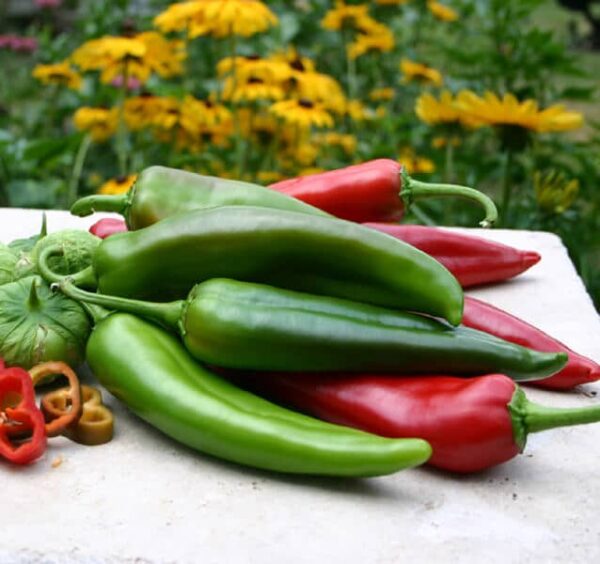 Large, smooth, and somewhat flat, mildly-hot chile, 7″ long. Ripens from medium green to red. Prolific and early for type. Sturdy, bushy plant.