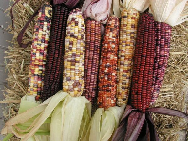 Hybrid ornamental developed for improved lodging resistance and color variation. 8″ – 9″ ears have various combinations of glossy red, white, pink, yellow, cola, purple, and variegated kernels. Some kernels are striped and spotted. Approximately 25% red husks. (1500 seeds per pound).