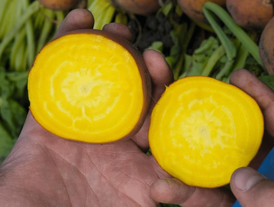 Yellow beet, beautiful in mixes or alone. Leaves have a nice sweet flavor. Healthy foliage with good resistance to leaf spot.