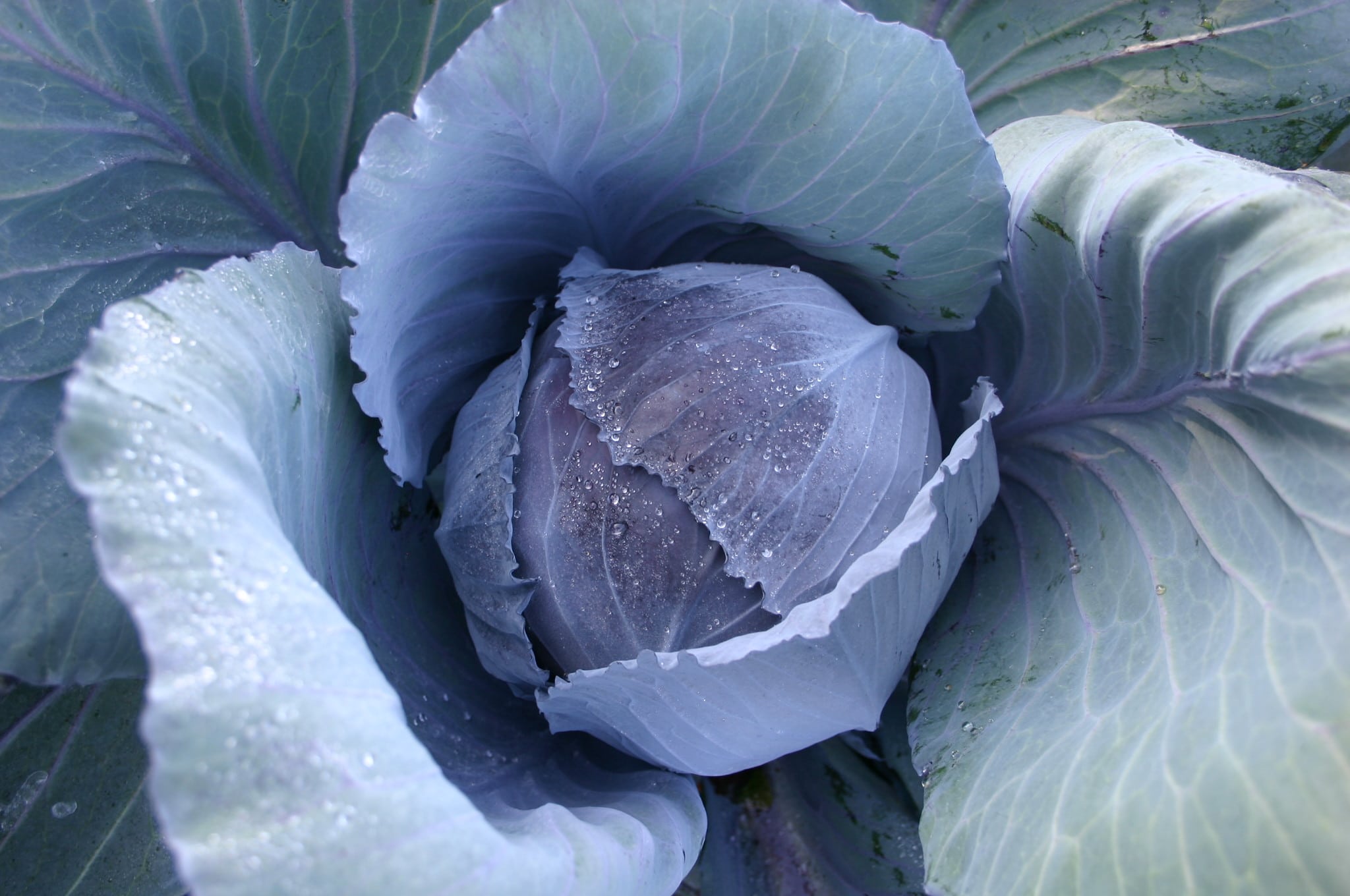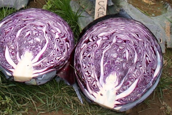 Round-oval, intensely dark red and dense heads grow on tall strong stems. It holds very well in the field, even in quite cold weather, and works for mid-term storage. The heads are large, up to 8 lbs, and are good for slaw.