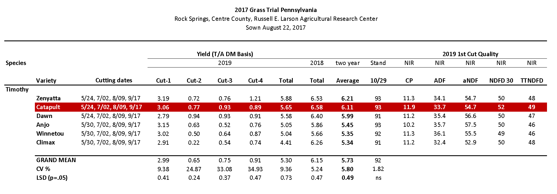 Bred for spring vigor and summer regrowth, Catapult comes out of the ground fast with rapid recovery after cutting. Its superior stand persistence lasts all-season and continues year after year. Ideal companion for legumes, other forage grasses, or as a pure stand.