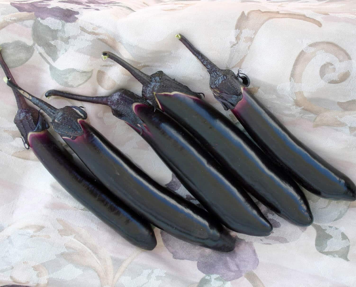 Not only is Dairyu early, but it will produce over a long season. 7″ – 10″ long fruit is nearly black with matching sepals. Fruit shape is long and thin with a slight pot-belly.