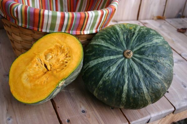World standard for Kabocha. Flesh is even thickness, dry, smooth to flaky and stringless with edible skin. The flavor is sweet and nutty. Needs to be cooked with water, not baked. Early with high yields.