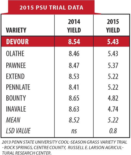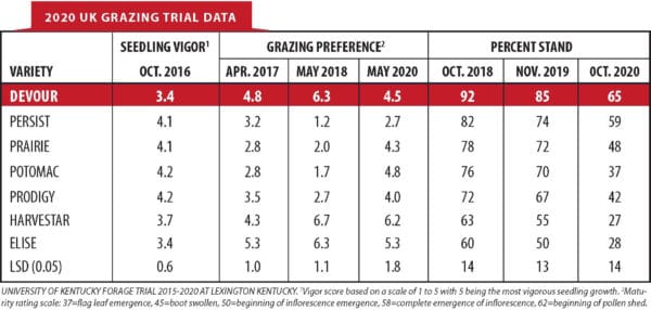 Developed to withstand the rigors of intensive grazing systems which can destroy lesser varieties. Extended periods of hoof traffic and feeding won’t deter Devour. Quick to establish, out competing weeds, and producing a better, high yielding pasture. Late maturing can be seeded with clover or alfalfa. High NDFD- very palatable.