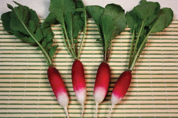 Oblong and blunt, rose-scarlet with a white tip. White crisp flesh with a mildly pungent flavor.