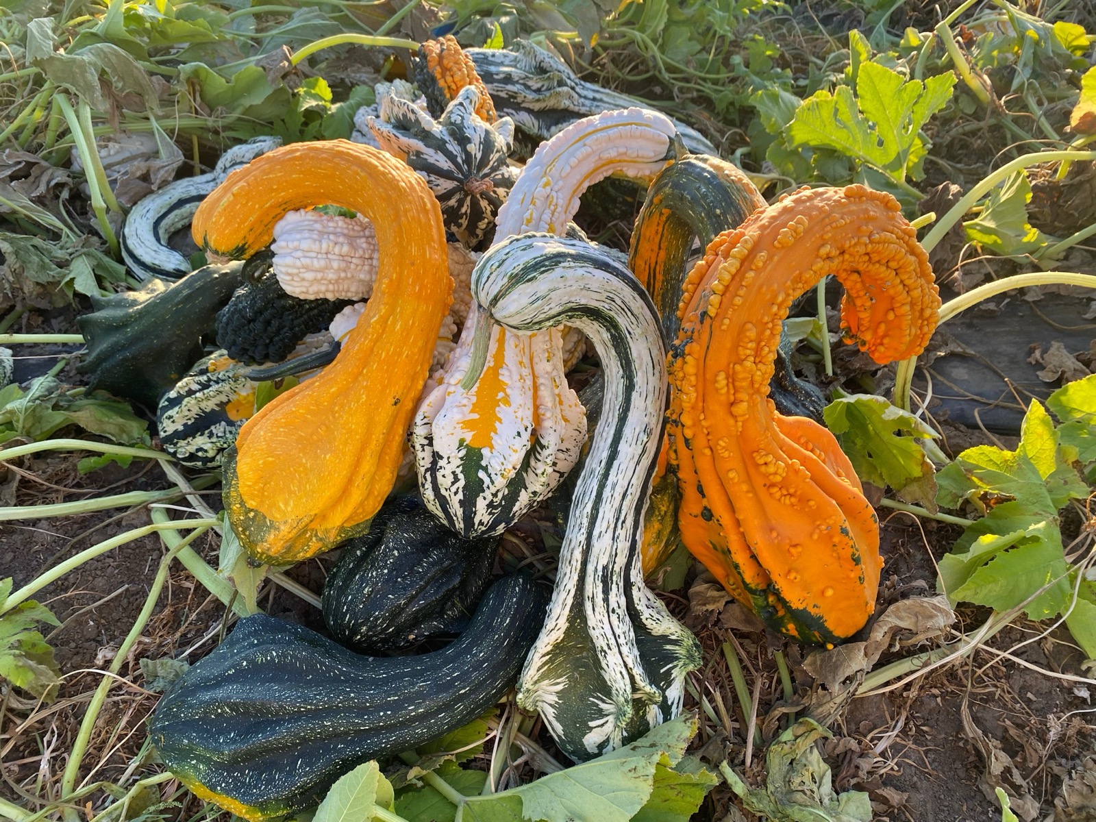 Blend of 3 fun and large, long-necked gourds. Gourds are colorful, winged, warted-making them eye-catching and unique.