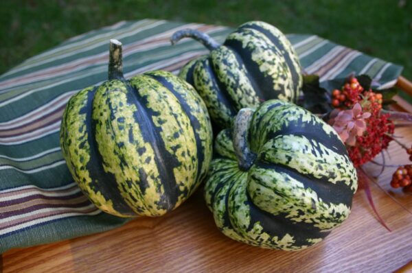 Vigorous, semi-bush plants produce fruit that are creamy white with dark-green mottled striping. At 4 1/2″ X 5 1/2″ in size, these very sweet squash have a blunt acorn form with a more tapered blossom end. Excellent as table fare or decoration.