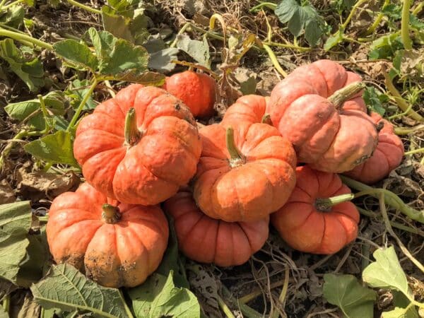 Unique appearance in a small stacking pumpkin that defies being ordinary! Fruit is salmon red with “rough” or bumpy skin, making it a colorful standout. Edible and ornamental, with a bright yellow interior.
