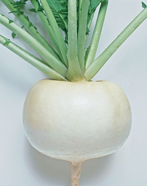 Smooth, uniform, white bulbs with semi-globe shape, reaching 4.5″-6″ in diameter. Use fall to winter only; can bolt if used for a spring sowing.