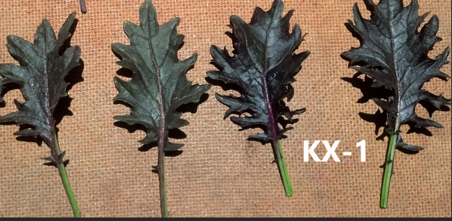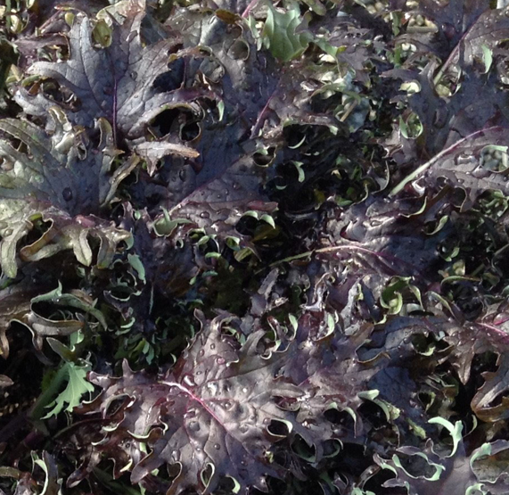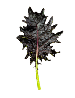 is used for salad mix, microgreens and braising mix. It is glossy and a deep purple-magenta color on top and a red tint to the back side. The color is intense from the start and vigor is similar to Red Russian, with an improved, thicker leaf.