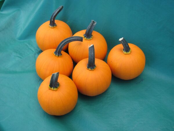 True pumpkin-look in a miniature. Good for high density planting. 7 – 8 fruit per plant, very uniform, good handle.
