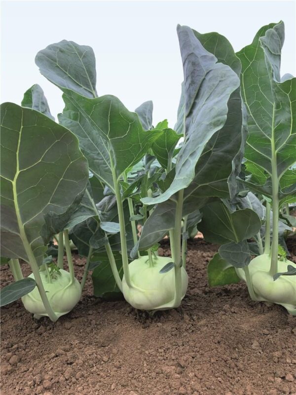This light green kohlrabi checks all the boxes. It has slender erect petioles for easy bunching, a thin taproot that is easy to snip off and truly fantastic sweet flavor. It is slow to split or crack.