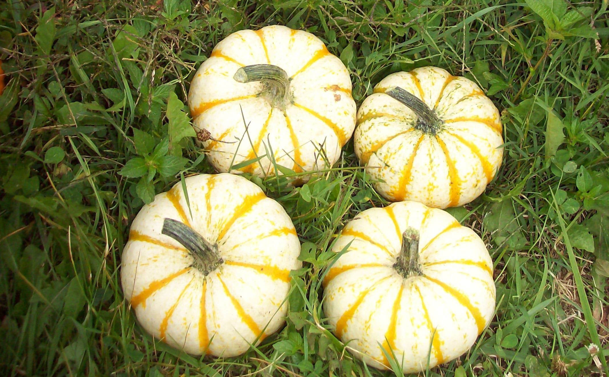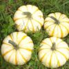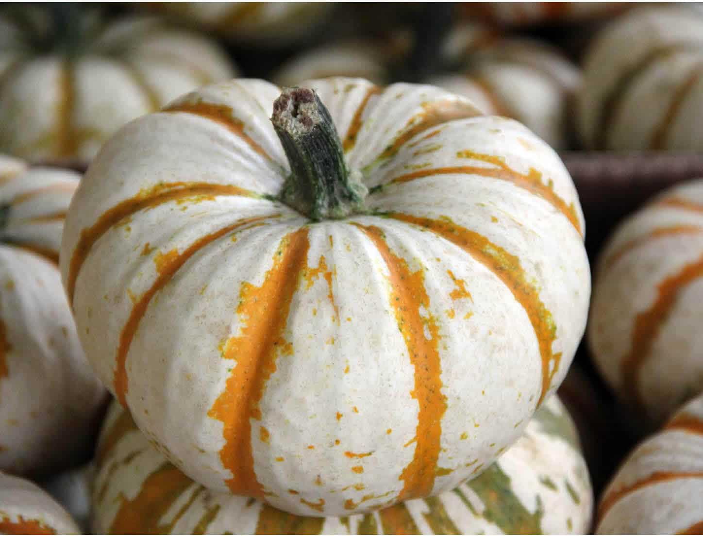 Eye-catching! Miniature fruit is flat in shape and boasts colorful, orange stripes on a white background. Unique for fall decorating.