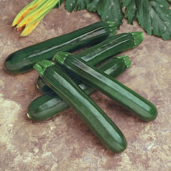 Deeply dark green and glossy, Noche’s attractive fruit have a long shelf life. Open, erect plants are nearly spineless resulting in less damage to the 7-8″ long fruit during harvest. Dark skinned zucchini’s are popular in the western regions.