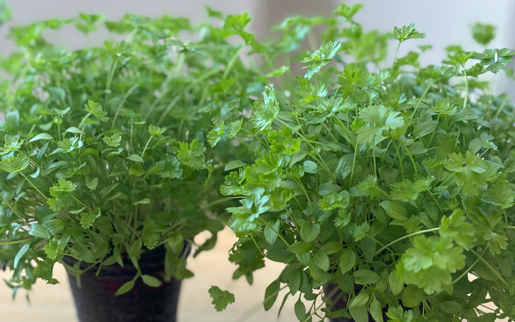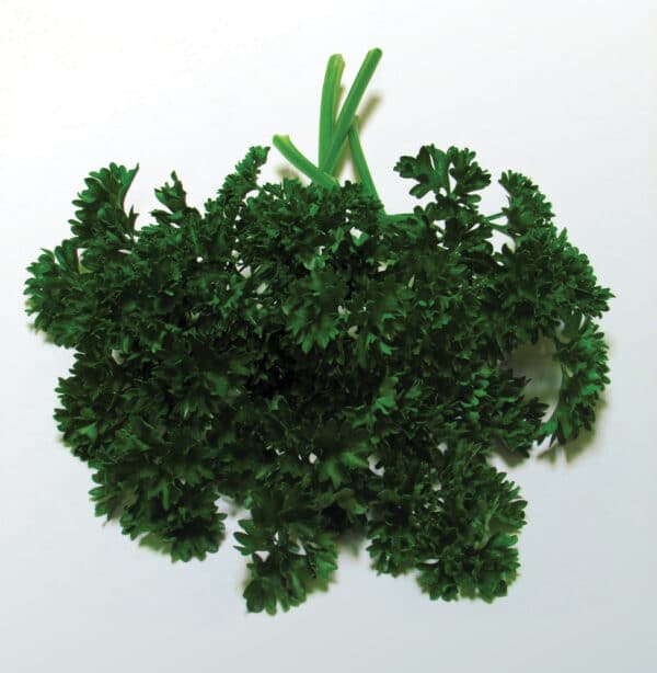 Double curled parsley with a strong, vigorous, upright growing plant with long stems for bunching. Dark green leaves maintain their color well.