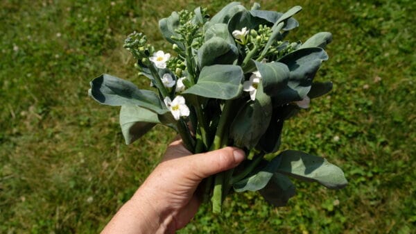 This hybrid Kailaan is grown like broccoli, spaced 6-8” in the row. The plant is tall. Cut off shoots with the leaves right before the white flowers are open. Stems are very sweet when raw. It will continue to send up shoots as long as it isn’t allowed to set seed.