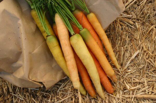 A mix of white, yellow, orange, and deep orange colors for eye-catching appeal! This is a “Cadillac” mix, with colors very well matched for both appearance and eating quality. Slightly tapered roots are 10″ long.