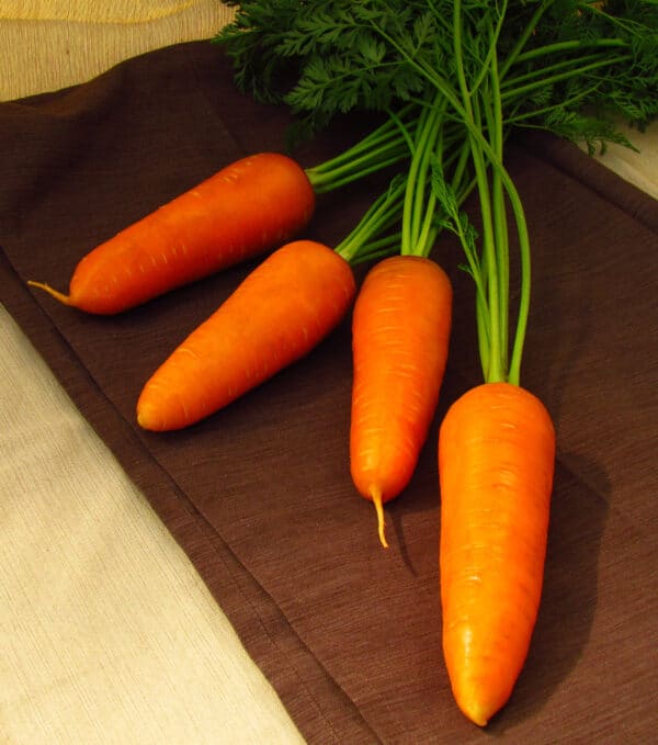 Tender and crisp carrot with pleasing sweetness, especially when young. Tops are 15″ and fairly strong. Good for bunching.