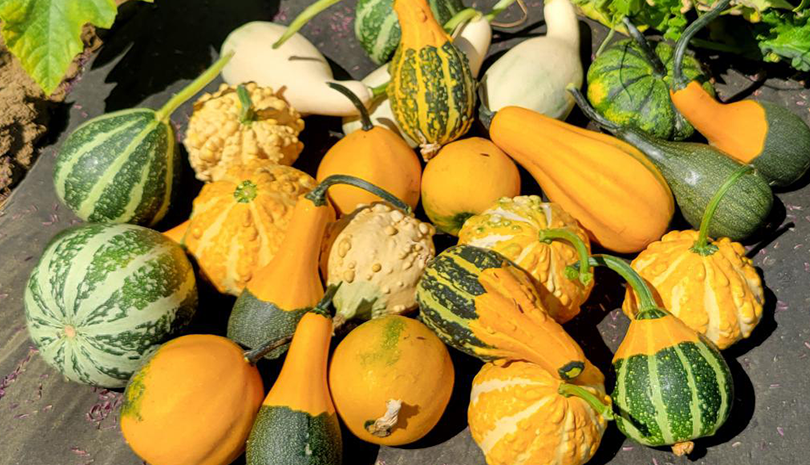 A mix of warted and non-warted gourds in traditional shapes like spoon, pear, orange. Colorful array of orange, gold, green, white, stripes, solids, bicolor.