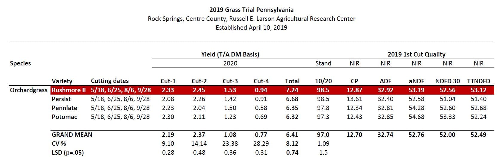 An early maturing orchardgrass ideal for use in grazing and hay operations. Rushmore II exhibits excellent winter hardiness making it an ideal fit for colder norther climates. With improved disease resistance, excellent establishment and persistence, Rushmore II can withstand grazing well.