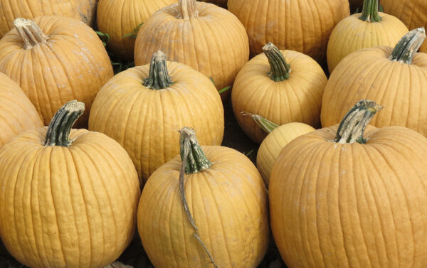 A tan pumpkin that offers larger size for bins. Fruit is uniformly colored with an attractive mocha color. Handle is thick; fruit is very distinctly ribbed.