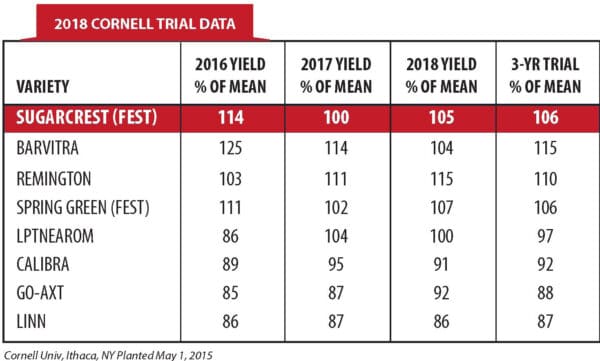 A new perennial-type festulolium that establishes quickly and has fast regrowth, yielding more tonnage per acre than the competition. Excellent persistence provides a highly palatable feed for years. Combined with improved winter-hardiness and disease resistance, Sugarcrest is unsurpassed for quality and longevity.