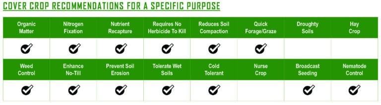 Rapid establishment to prevent wind and water erosion. Improves soil permeability for increased air and water penetration, reduces soil compaction, and increases root development potential. Recycles nutrients that would have been lost to leaching or runoff. Fixes atmospheric nitrogen to increase soil nitrogen levels. Potential forage for fall and spring grazing, spring silage or hay.