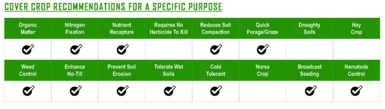 Rapid establishment to prevent wind and water erosion. Recycles nutrients that would have been lost to leaching or runoff. Fixes atmospheric nitrogen to increase soil nitrogen levels. Improves soil permeability for increased air and water penetration, reduces soil compaction and increases root development potential. Best used prior to corn, wheat or other crops requiring significant nitrogen inputs. Potential forage for fall and spring grazing, spring silage or hay.