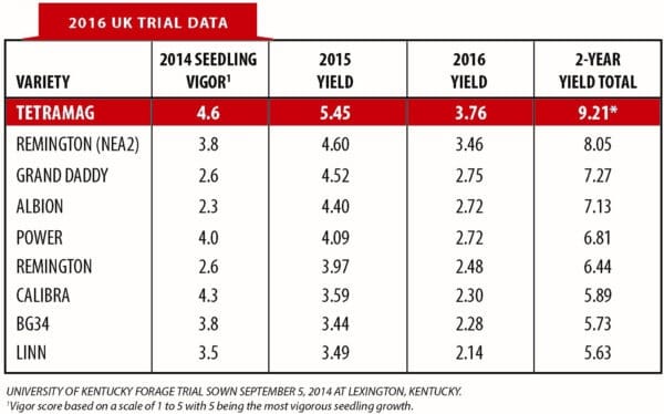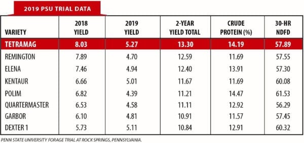 Excellent yield potential and stand-life expectancy of 3-5 years. Highest ranking entry in Cornell University and University of Kentucky forage trials. This yield potential is due in part to TetraMag’s unparalleled seedling vigor. Improved forage quality and continues to produce all season long. Seed at 35-45 lbs alone, 10-15 lbs. in mixes.