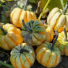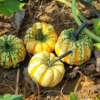 A lovely ornamental acorn with high eating quality. Thriller has a lovely tri-color pattern of green, orange, and cream, making it extra appealing to consumers. The green color holds well on mature fruit.