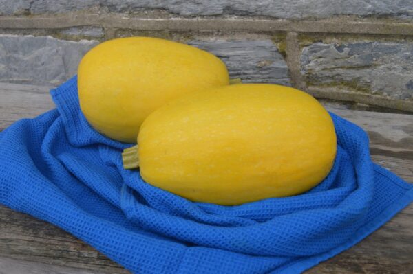 Unique space saving bush habit with typical spaghetti squash fruit.