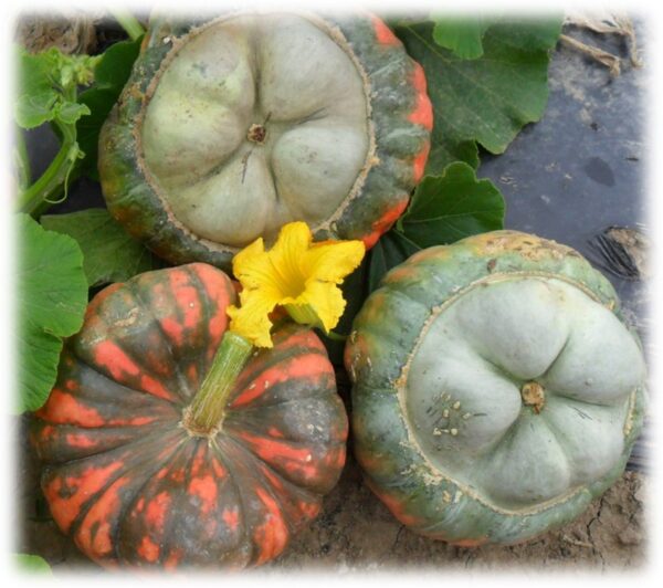 Fun specialty item with its dark green and salmon-orange coloring and Turks Turban-like shape. 4-6 lbs. Vigorous bush plant.
