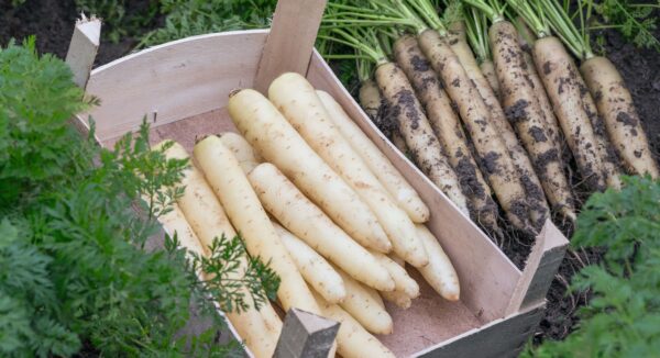 The sweetest variety in the colored carrot assortment. Long tops, ivory white 10″ tapered roots, stores well.