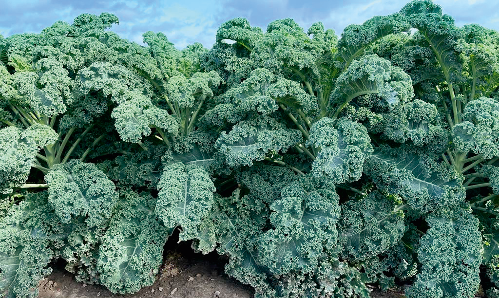 The curly kale looks like Winterbor, with a tall plant and straight petioles/leaf stems for bunching. Its yield is excellent, and it holds up to heat, cold, and dry growing conditions.